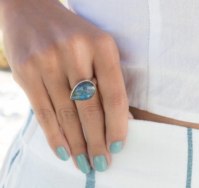 Vakker, enkel og hÅndlaget " Tear Drop " Designring i 925s sølv med stor sten i Labradorit