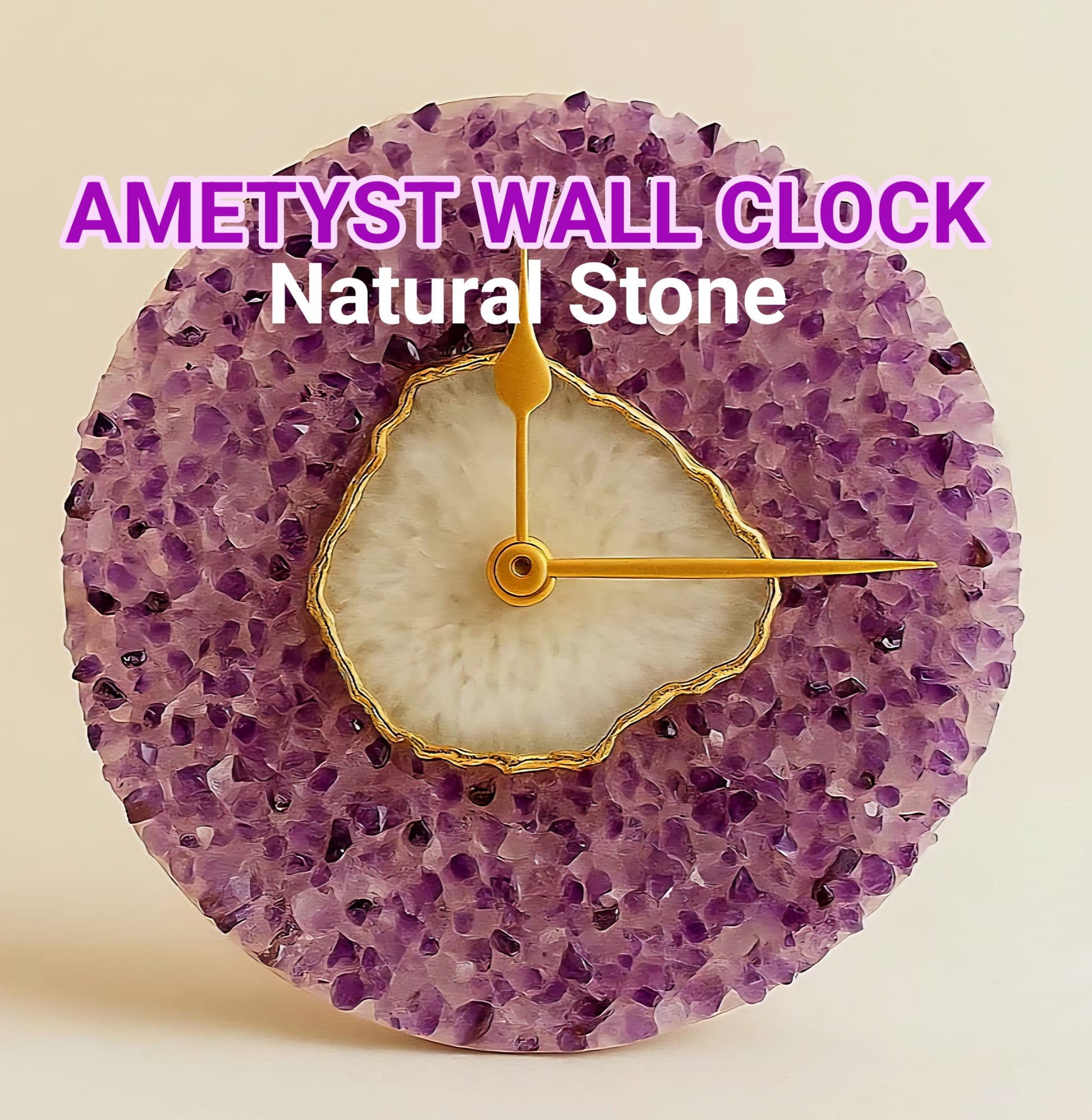 Vakker håndlaget Agat klokke med Ametyst , gold electroplated ) , 25cm m/ quartz ur. Veggoppheng og stand inkludert.