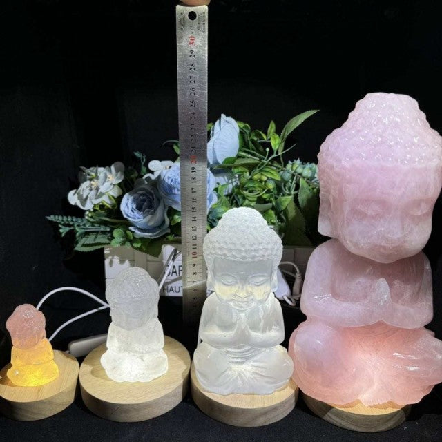 Vakker, håndlaget Buddha 7.5cm Rose Quartz inkl led trebase m/usb, small