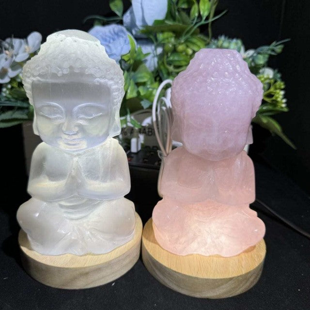 Vakker, hÅndlaget Buddha 7.5cm Selenite inkl led trebase m/usb, small