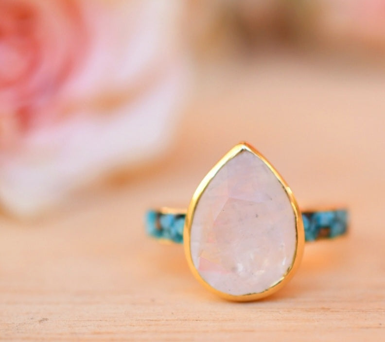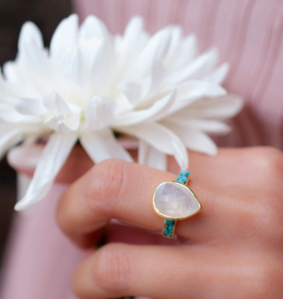 Vakker, håndlaget designring med stor Månesten & Turquise Mosaic i oval form, gold plated