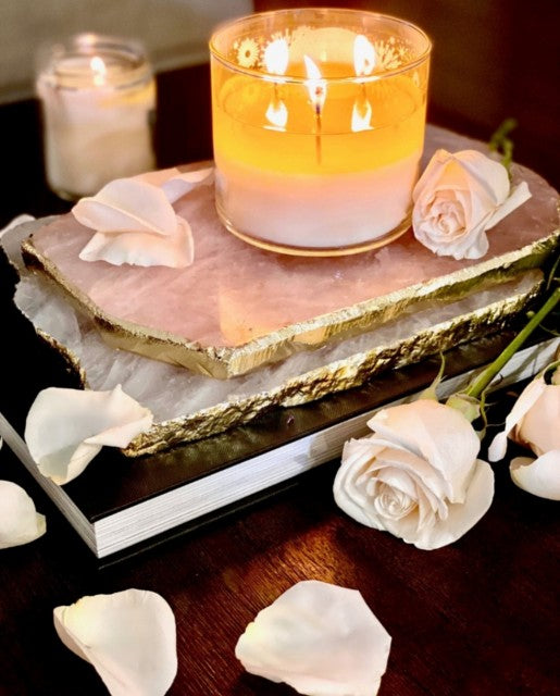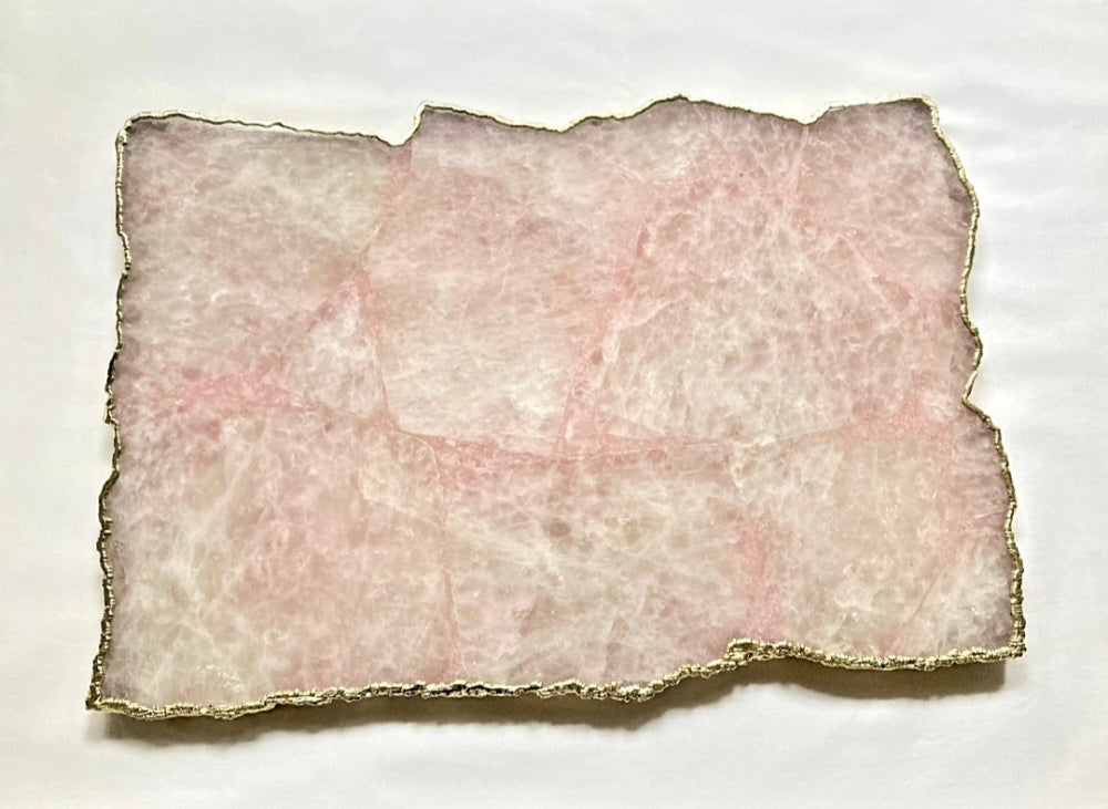Håndlaget XL ( 28x18cm )Rosenkvarts Coaster decorskive med gullbelagt kant fra India. Denne Coasteren har en fantastisk farge og klarhet og er både vakker og stor, XL ca.18x28cm..Leveres i 3 størrelser .( ca. mål )