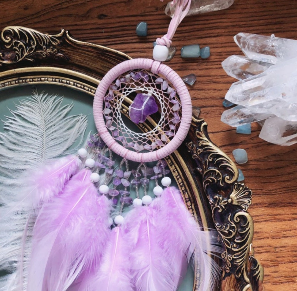 Håndlaget, vakker Drømmefanger ..Ekte krystaller er benyttet med Ametyst råkrystaller. Måler 8x30cm. Disse er fremstilt med farget andefjær