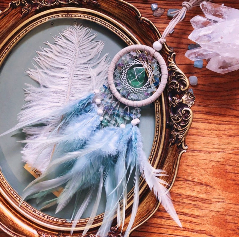 Håndlaget, vakker Drømmefanger. Ekte krystaller er benyttet med Fluorite råkrystaller. Måler 8x30cm. Disse er fremstilt med farget andefjær