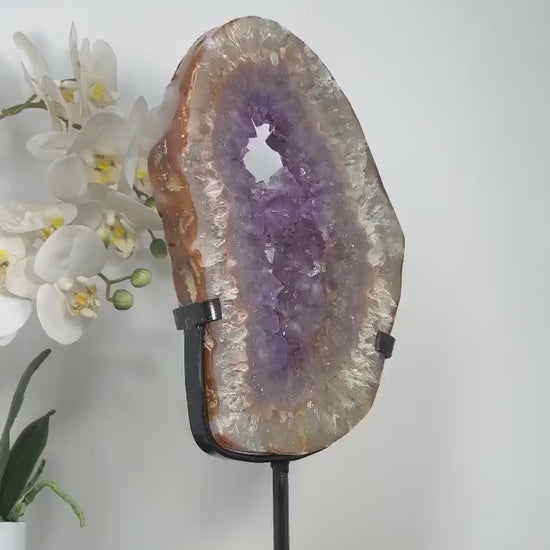 Explore the enchanting world of Uruguay's finest minerals with our unique collection of hand-polished specimens. Each piece is meticulously crafted and accompanied by a custom-made metal stand, enhancing its natural beauty and elegance.