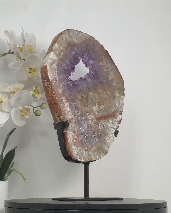 Explore the enchanting world of Uruguay's finest minerals with our unique collection of hand-polished specimens. Each piece is meticulously crafted and accompanied by a custom-made metal stand, enhancing its natural beauty and elegance.